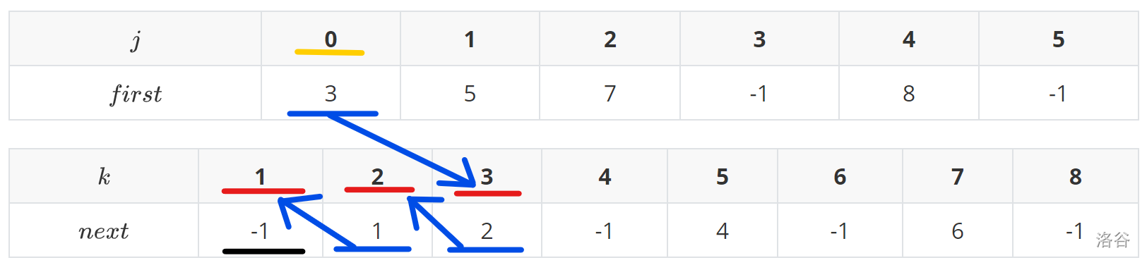 黄的表示起点,蓝的表示边的编号,红的表示下一条边的储存位置,黑的表示读取终止